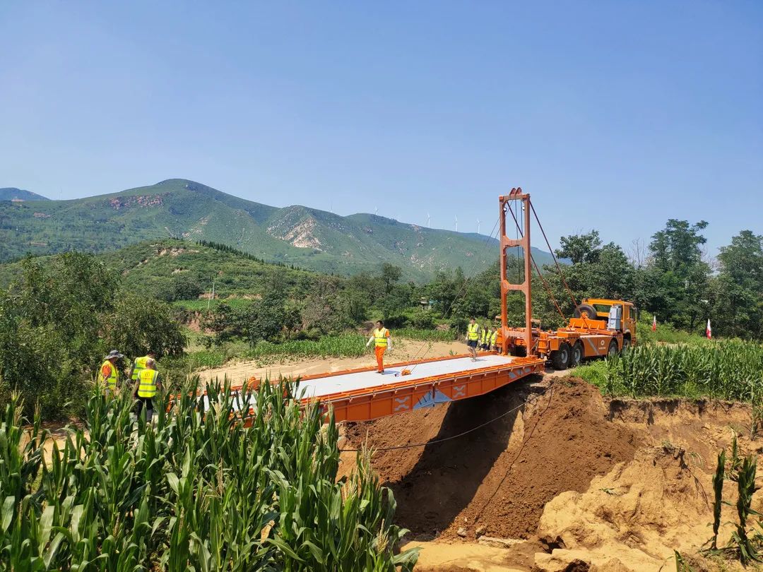 接上級公路部門通知,通往新密市牛店鎮(zhèn)花家店村因道路被毀,村民被困村莊內(nèi)數(shù)日,外界救援物資無法順利送達(dá)。2021年7月30日,我公司派出一支青年隊伍,組成公路應(yīng)急搶險小組,12名隊員駕駛兩臺模塊化汽車鋼架橋,于早上7點整裝待發(fā)緊急前往目的地進(jìn)行救援。