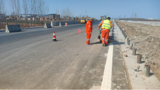 施工現(xiàn)場,施工人員組織安全技術交底,對現(xiàn)場的安全、保通措施、標線外觀、質量做出詳細安排后,大家分工明確,熱火朝天的干起來。標線施劃中,他們嚴格遵循施工標準與規(guī)范,從前期的場地清理,確保地面干凈、無雜物,為標線施劃提供良好基礎,到精準測量標線位置,每一個環(huán)節(jié)都容不得半點馬虎。熱熔標線施劃時,操作人員熟練地控制著機器,使標線的寬度與厚度均勻一致、逆反射系數(shù)合格。在他們精心操作下,一條條嶄新的標線在陽光下熠熠生輝,與平坦的道路相得益彰。